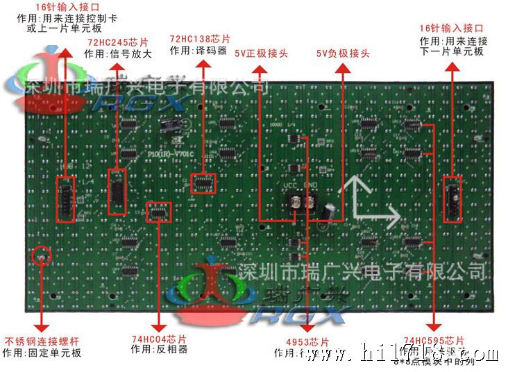 2、此单元板含有驱动芯片和输入缓冲芯片,连接到LED显示屏控制系统即可显示视频、图像和文字信息等;