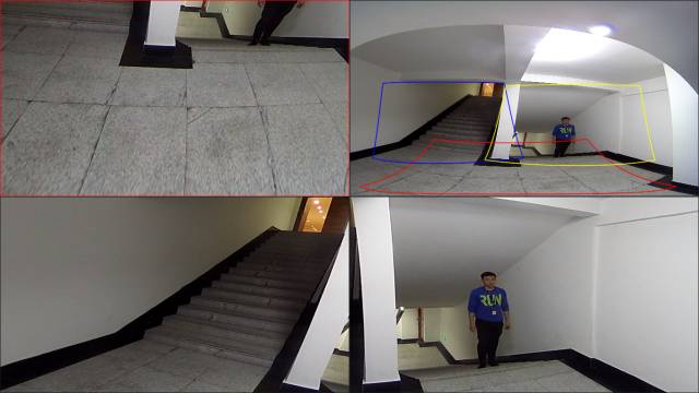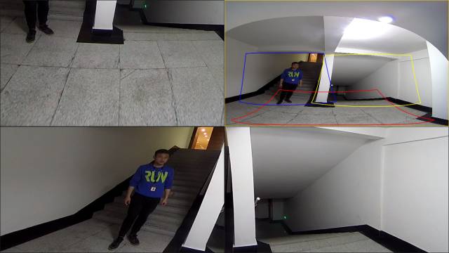预览效果:能够对上楼梯、楼梯拐角、下楼梯等重点区域进行监控,画面简单易懂,一目了然,一个鱼眼摄像机就搞定!