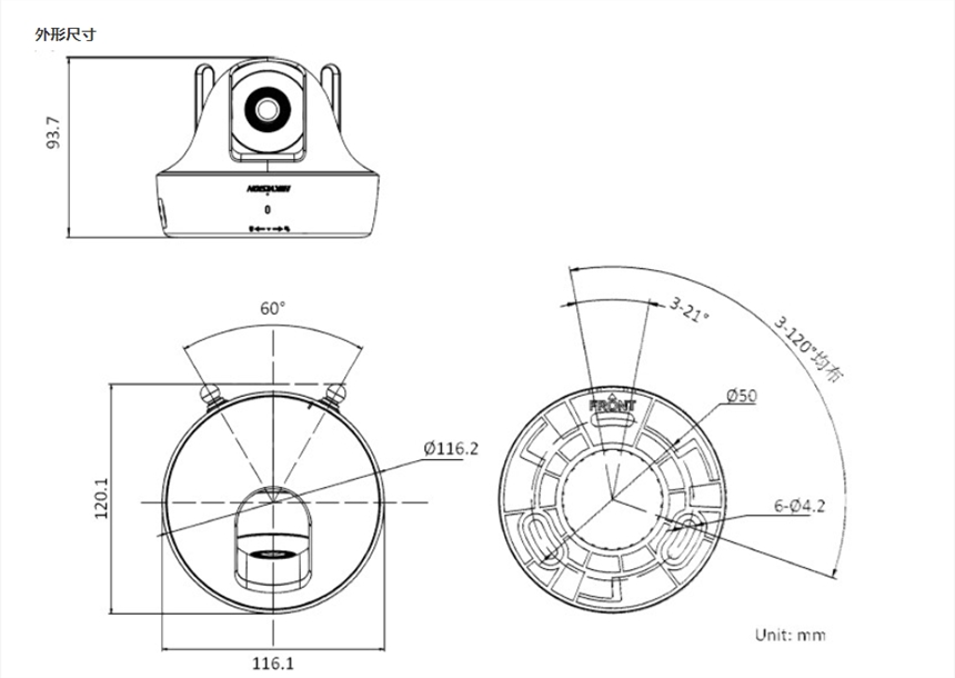 DS-IPC-E43H-IWPT 海康威视300 万 1/3" CMOS 无线PT 海螺网络摄像机 外形尺寸: