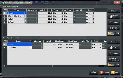 在上节所述Kit Standards窗口,选定要编辑的校准件,设置起始和终止频率(Min Freq / Max Freq),选定要编辑的校准件,点击View/Modify,进行参数设置。