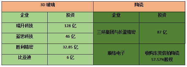 国内相关产业纷纷加大力度投资非金属材质玻璃和陶瓷,据手机报在线不完全统计:年初,瑞声科技智能手机3D玻璃等微型精密元器件项目动工,投资总额达128亿元人民币。蓝思科技华南地区工厂将落户东莞塘厦,预计投资总额达45亿元人民币,项目计划用地约194.8亩,一期将于2017年3月投产,预计年产值达15亿元。蓝思科技还表示,将发力3D玻璃,目前蓝思科技3D玻璃产能为2700万片/年,蓝思科技表示将继续扩大产能,预计今年的3D玻璃出货量会达到3000万片至4000万片。