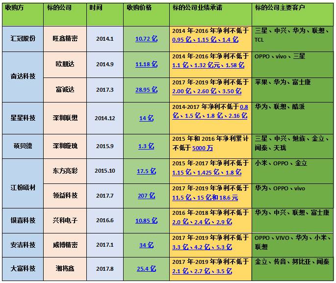 据手机报在线不完全统计,过去几年中精密结构件行业的收购案件有:硕贝德收购深圳璇玫、安洁科技收购威博精密、奋达科技收购欧朋达和富诚达、江粉磁材收购东方亮彩收购领益科技及后者借壳上市、银禧科技收购兴科电子66.2%股权、星星科技收购深圳联懋100%股权、汇冠股份收购旺鑫精密100%股权、永贵电器收购翊腾电子100%股权等。