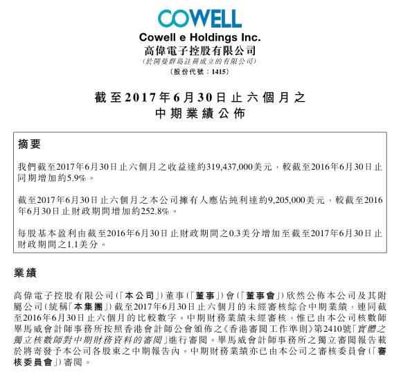 从高伟电子营收来看,据其前不久公布上半年业绩,2017年6月30日止六个月之收益达约3.19亿美元,较截至2016年6月30日止同期增加约5.9%。截至2017年6月30日止六个月之本公司拥有人应佔纯利达约920.5万美元,较截至2016年6月30日止财政期间增加约252.8%。