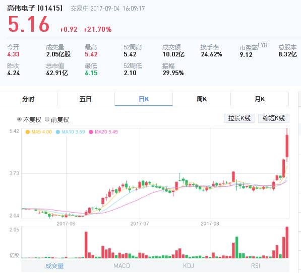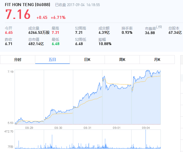 但是在随后的两年中,其股价一直走低,在2016年全年中一直处于不温不火状态,这与苹果去年的销量有很大的关系,而在近期从6月初到9月4日,其股价开始飙升,从2元每股左右上涨到目前的5.35元每股!6月份其从2元左右上涨到3元多,随着一直稳定在3元左右,直至8月底开始爆发!