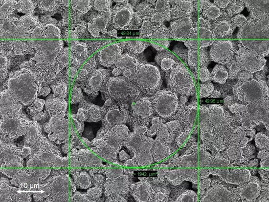 采用显微硬度计测量极片的弹性,硬度计为平面压头,直径50微米,面积较大,测试结果能够大面积反应极片的弹性性质,极片左压痕测试后,表明形貌如图2所示。压痕测试采用位移控制模式,压痕深度为1μm,低于电极厚度的10%,排除了集流体和胶的影响。压力加载速度为恒定速率0.5009mN/s,压痕深度达到1μm后,以相同的速率卸载载荷,直到载荷为0.2mN。