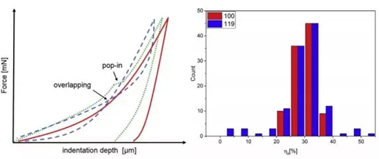测试位置如图3所示,每个样品上测试约119个点,相互之间间隔1mm,以免结果产生相互影响,典型测试载荷-位移结果如图所示,将载荷-位移曲线存在重叠或有平台的结果排除(图4左图),选择100个测试点分析实验结果(图4右图)。