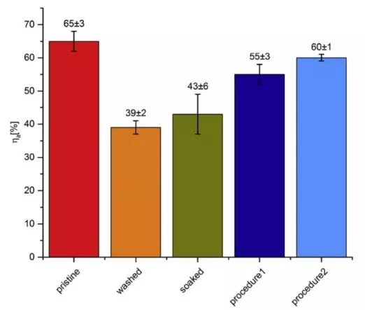 为了实验结果可重复性,作者首先对原始NMC111正极极片测试了8个样品,800多个点。弹性应变能比例为 ηit=(65±3)%。循环后的电池极片拆解后进行压痕测试,首先必须使用DMC清洗。因此,作者还研究了DMC清洗程序对测试结果的影响。