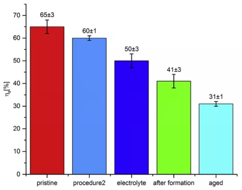 电解液浸泡之后,弹性应变能比例变为(50 ± 3)%,下降了10%,这主要是粘结剂吸收DMC后会发生溶胀导致的。化成后极片弹性应变能比例变为(41 ± 3)%,又下降了10%。循环容量衰减到80%的电池极片弹性应变能比例变为(31 ± 1)%。