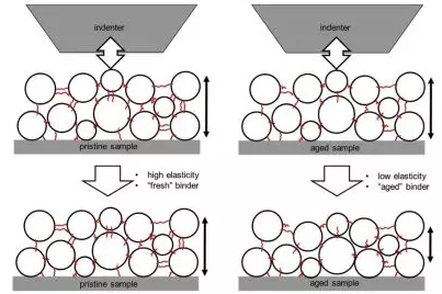 对于极片中粘结剂的特性,我们主要通过测量结合强度或者剥离强度,表征其粘结性能。为了研究粘结剂的弹性以及电池循环后弹性的变化,德国University of Muenster的Wendt C采用平面压头研究了不同阶段极片的性能。