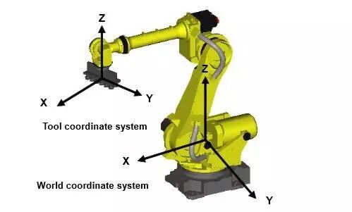 世界坐标系是被固定在空间上的标准直角坐标系,其被固定在由机器人事先确定的位置。用户坐标系是基于该坐标系而设定的。它用于位置数据的示教和执行。有关各机器人(R系列/M系列/ARC Mate/LR Mate)的世界坐标系原点位置的大致标准为: