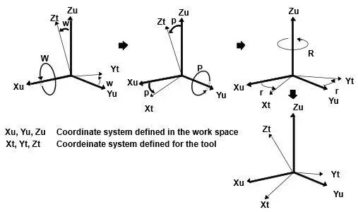 直角坐标系中的机器人的位置和姿态,通过从空间上的直角坐标系原点到工具侧的直角坐标系原点(工具中心点)的坐标值x、y、z和空间上的直角坐标系的相对X轴、Y轴、Z轴周围的工具侧的直角坐标系的回转角w、p、r予以定义。下图2为(w、p、r)的含义。
