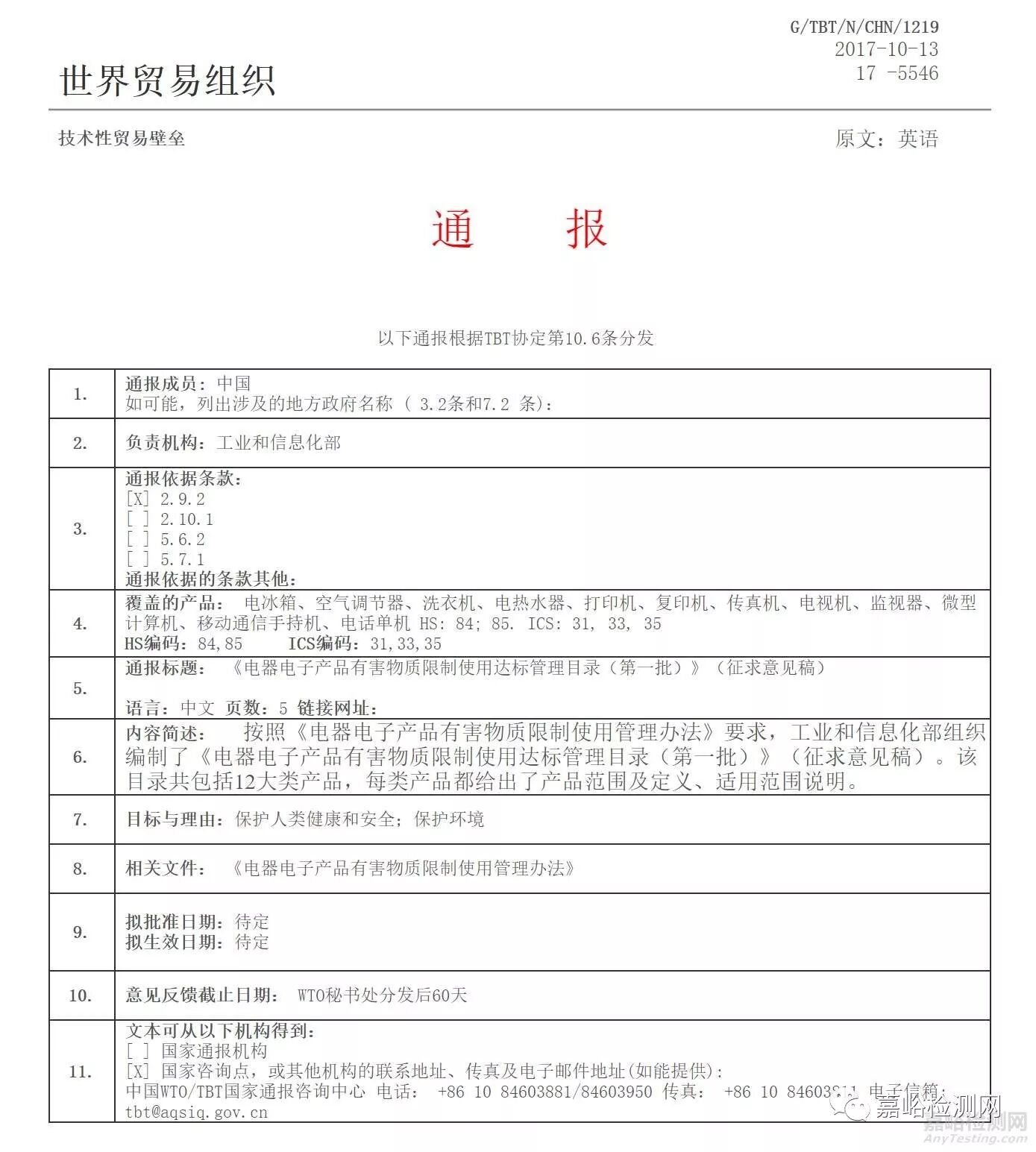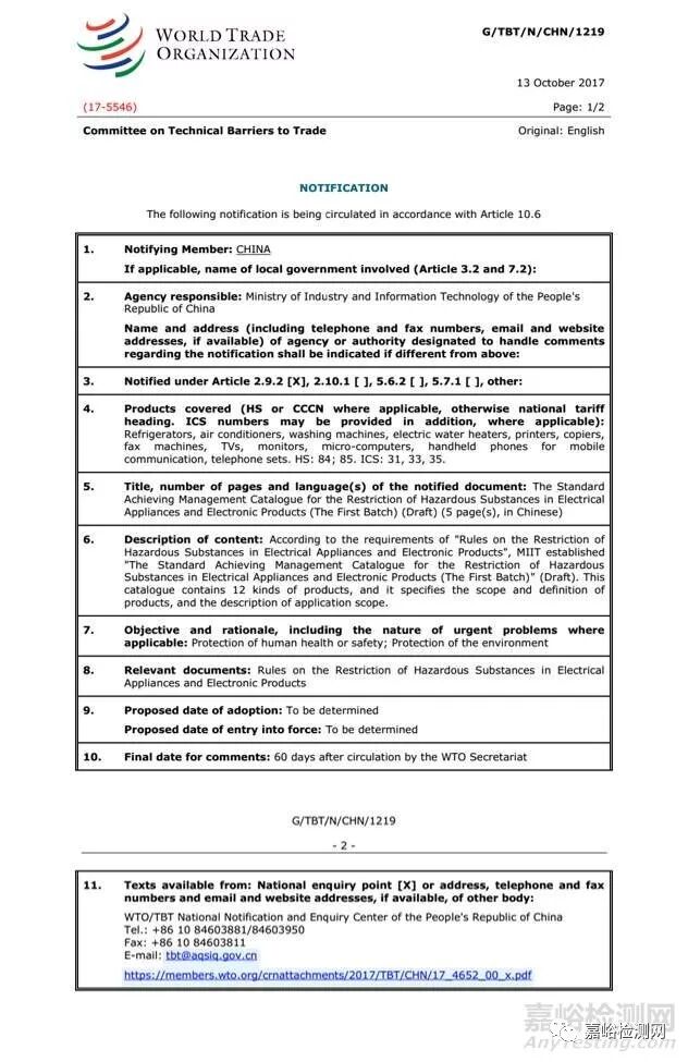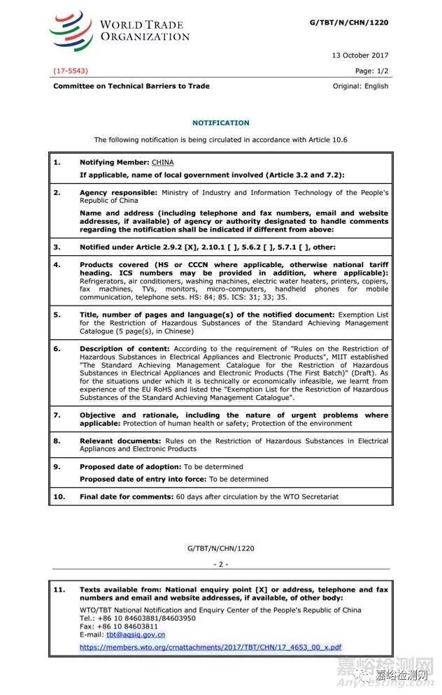 中国RoHS批《达标管理目录》与“应用例外情况”已经于2017年10月13日在WTO上进行TBT通报了,通报时间为60天,也就是说在2017年12月11日结束通报,之后还要进行评议程序。嘉峪检测网将继续跟进事件进展,请留意关注。