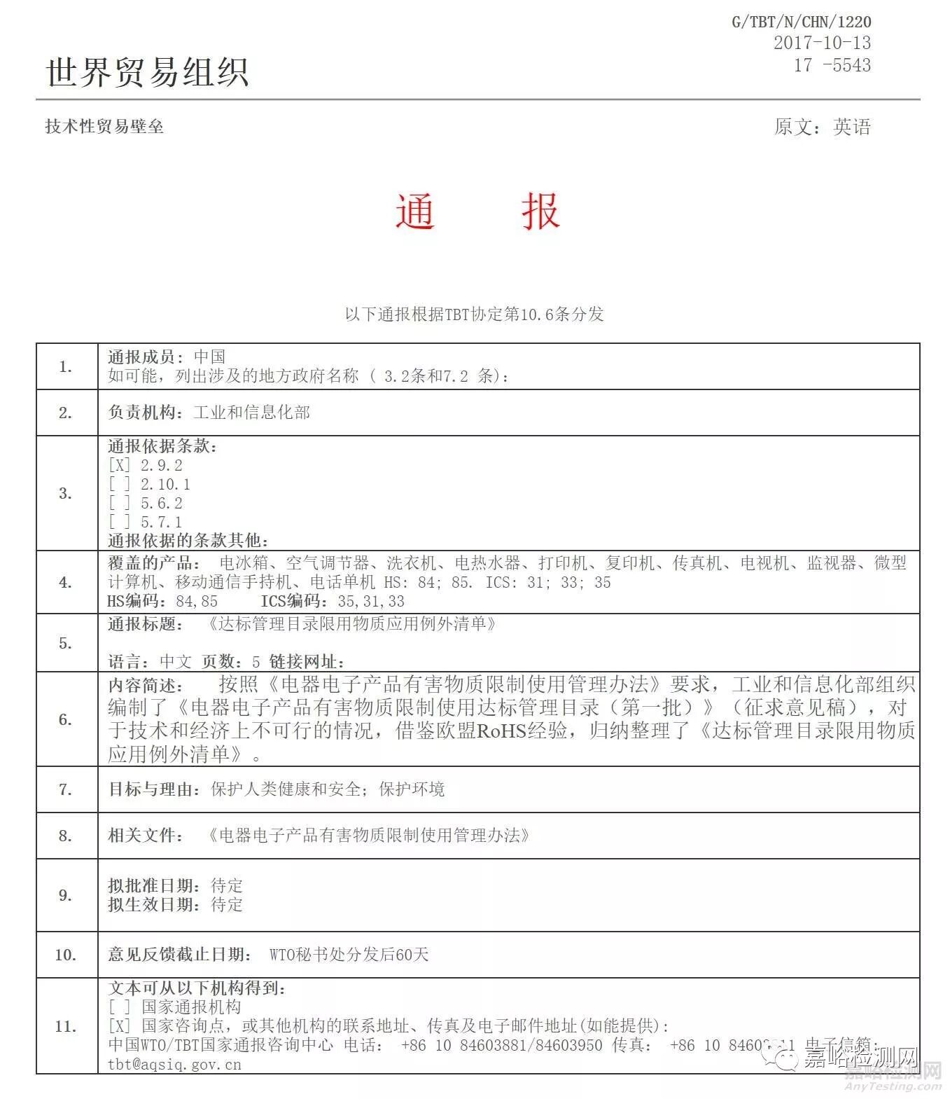 下面的截图为中国RoHS批《达标管理目录》与“应用例外情况”的WTO/TBT通报