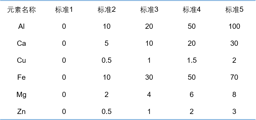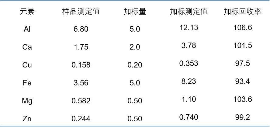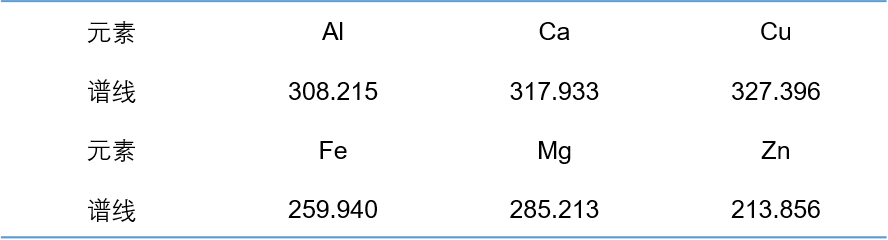 实验过程 1 仪器特点 观测方式:径向观测 分光系统:中阶梯光栅与棱镜交叉色散结构,全谱瞬态直读 检测器:大面积背照式CCD芯片,高紫外检出效率,宽动态范围 光源:高效固态射频发生器,小体积高效率 2 仪器参数 天瑞仪器ICP-2060T工作条件 3 实验方法 称取一定量污泥样品,加入一定比例的混酸,使用微波消解仪消解。待样品冷却后取出,定容至100mL容量瓶待测。 4 分析谱线 表2天瑞仪器ICP-2060T谱线选择(nm) 5 标准曲线 Al、Ca、Cu、Fe、Mg、Zn标准溶液(国家钢铁材料测试中心,1000 μg/mL)配制曲线浓度如表3 ,线性相关系数大于0.999。 表3 标准曲线浓度(μg/mL) 6 测定结果 在实际样品中加入被测元素,其加标回收率93.4%-106.6%为之间,满足定量要求。 表4 实际样品分析结果(%) 结论 本方法采用天瑞仪器ICP-2060T电感耦合等离子体发射光谱仪测定污水处理厂中污泥中重金属元素,加标回收率介于93.4%-106.6%之间,适用于污泥中铝、钙、铜、铁、镁、锌等元素的检测。