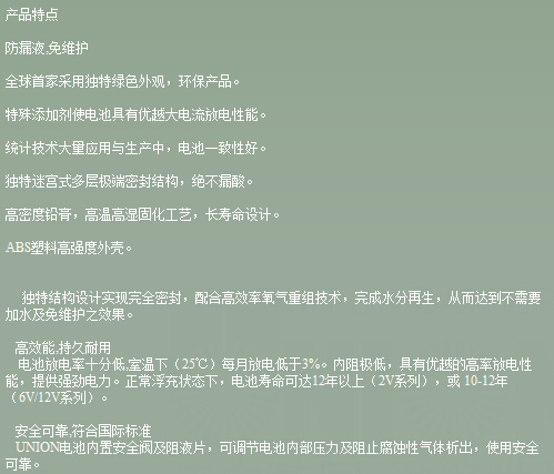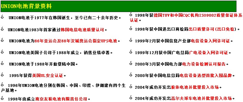 韩国 UNION 电池诞生于1977年,1983年通过韩国电信KOREAN PTT电池质量认可和美国UL安全认证,为1986年亚运会及88年汉城奥运会指定备用电源。UNION BATTERY CORPORATION,随业务发展,UNION电池先后在韩国、印度、中国、 伊朗等国家建立了生产基地。其中国大陆生产基地佛山市尤尼电池有限公司是中国早专业生产阀控式密封铅酸蓄电池(VRLA Battery)的中韩合资企业,主要生产检测设备皆采用进口名厂设备。20%以上员工在韩国总部接受过专业培训,并拥有健全的ISO9001-2000质量保证体系。