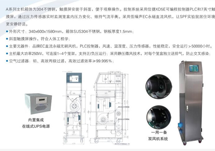 ?监视系统:7英寸彩色触摸屏,中英文操作,实时显示笼内压力、温湿度、风量、换气次数等参数;