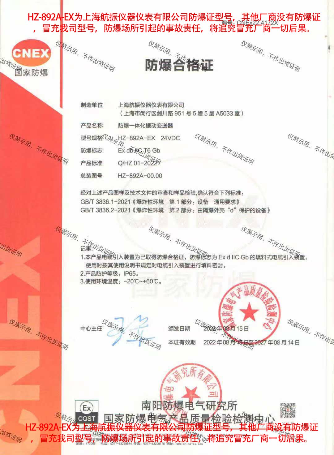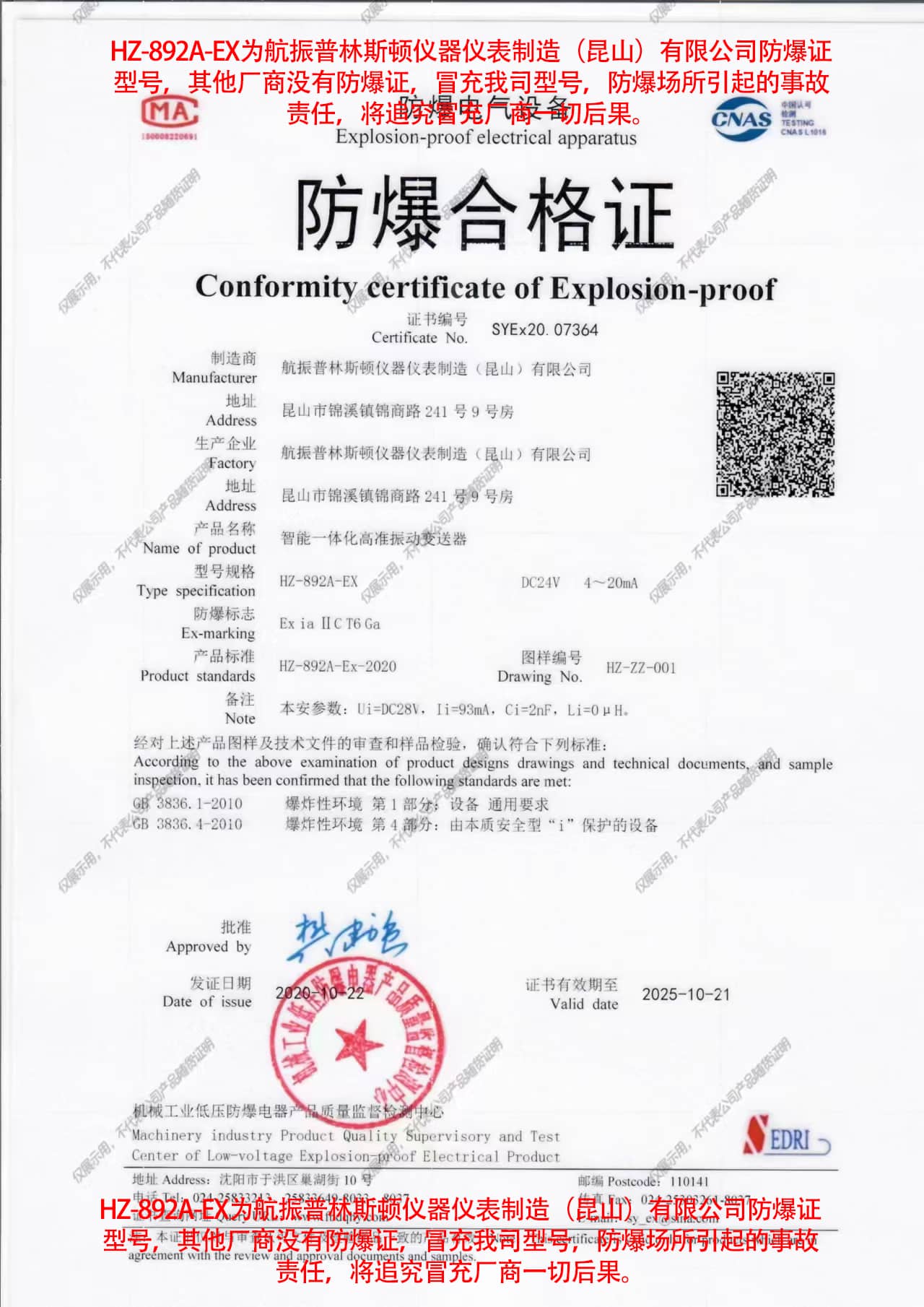 权威防爆认证:HZ-892A-EX 数显防爆振动变送器防爆等级 ExiaIICT6 Ga(符合 GB/T 3836.1-2010、GB/T 3836.4-2010 标准),可安全应用于 IIA、IIB、IIC 类 T1-T6 组可燃性气体环境,全面覆盖危险 1 区、2 区,杜绝监测设备成为点火源风险。