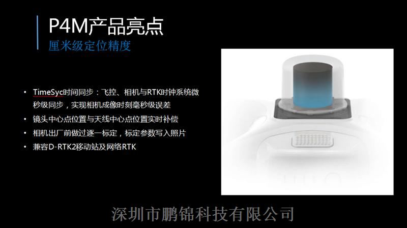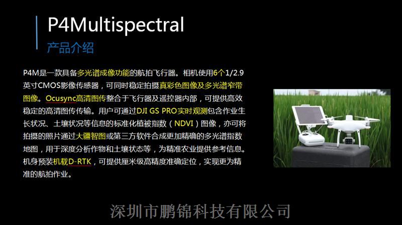 P4M是一款具备多光谱成像功能的航拍飞行器。相机使用6个1/2.9英寸CMOS影像传感器,可同时稳定拍摄真彩色图像及多光谱窄带图像。Ocusync高清图传整合于飞行器及遥控器内部,可提供高效稳定的高清图传传输。用户可通过DJI GS PRO实时观测包含作业生长状况、土壤状况等信息的标准化植被指数(NDVI)图像,亦可将拍摄的照片通过大疆智图或第三方软件合成更加的多光谱指数地图,用于深度分析作物和土壤状态等,为精准农业提供参考信息。机身预装机载D-RTK,可提供厘米级高准确定位,