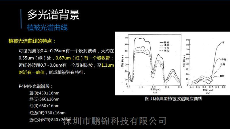 实现更为精准的航拍作业。每个物体表面都能反射出一些它所接收的光,具有不同表面特征的物体以不同的方式吸收或反射太阳的辐射。反射光与入射光之比成为反射率。多光谱图像传感器通过电磁光谱捕获特定频率的图像数据,可通过使用滤光器或对特定波长敏感的仪器获取指定波段的地物信息。多光谱背景植被光谱曲线植被光谱曲线的特点:可见光波段0.4~0.76um有一个反射波峰,大约在0.55um(绿)处,0.67um(红)有一个吸收带;近红外波段0.7~0.8um有一个反射陡坡,至1.1um附近有一峰值,形成植被独有特征。