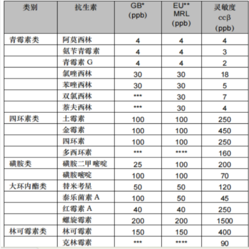 所列的ccβ灵敏度是在控制时间(CT)获得的。要在控制时间进行测试,除了待测试的牛奶样品外,还需要额外添加一个阴性控制奶样,当阴性控制奶样变黄时,读取其他测试奶样的结果。当使用固定的孵育时间(3小时)读取结果时,检测灵敏度会降低。
