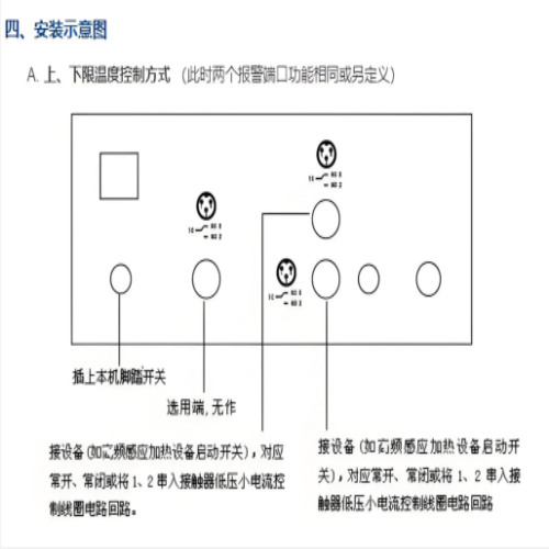 使用本机 主、辅热端囗 , 可控制 高、中频感应加热机及电热丝加热等设备,当工件加热到上限温度时停止加热 -- 当工件低于下限温度时又开始加热,循*环往*复,控制工件温度在上、下限温度之间,实现自*动控温,及定时加热、定温定时加热。