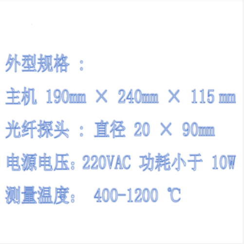 外型规格 : 主机 190( 前后 ) × 240( 宽 ) × 115mm ( 高 )mm 光纤探头 : 直径 20 × 90mm