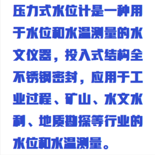压力式水位计是一种用于水位和水温测量的水文仪器,投入式结构全不锈钢密封,应用于工业过程、矿山、水文水利、地质勘探等行业的水位和水温测量。