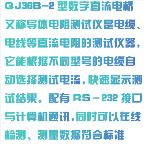QJ36B-2型数字直流电桥又称导体电阻测试仪是电缆、电线等直流电阻的测试仪器,它能根据不同型号的电缆自动选择测试电流,快速显示测试结果。配有RS-232接口与计算机通讯,