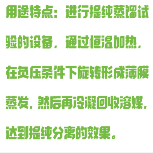 用途特点:进行提纯蒸馏试验的设备,通过恒温加热,在负压条件下旋转形成薄膜蒸发,然后再冷凝回收溶媒,达到提纯分离的效果。产品可与循丨环水式多用真空泵、隔膜真空泵、低温冷却(真空)泵、循丨环冷却器、恒温循丨环器、低温冷却液循丨环泵等配套组成系统装置。