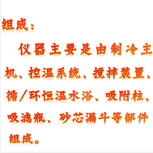 ?仪器主要是由制冷主机、控温系统、搅拌装置、循/环恒温水浴、吸附柱、吸滤瓶、砂芯漏斗等部件组成。