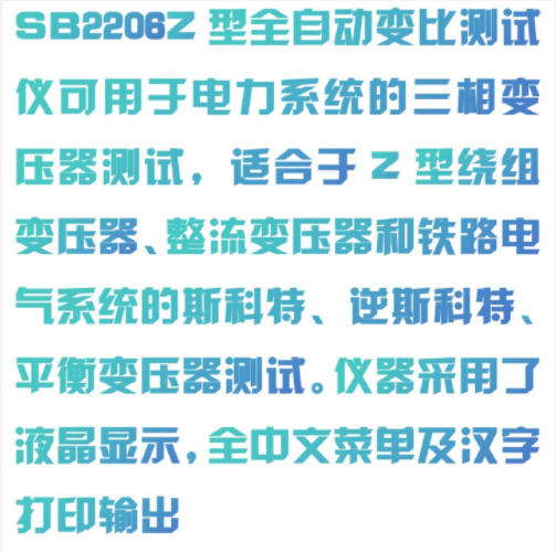 SB2206Z型全自动变比测试仪可用于电力系统的三相变压器测试,适合于Z型绕组变压器、整流变压器和铁路电气系统的斯科特、逆斯科特、平衡变压器测试。仪器采用了液晶显示,全中文菜单及汉字打印输出,是电力系统、变压器厂家和铁路电气系统的变压器变比组别极性测试仪。