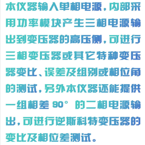 本仪器输入单相电源,内部采用功率模块产生三相电源输出到变压器的高压侧,可进行三相变压器或其它特种变压器变比、误差及组别或相位角的测试,另外本仪器还能提供一组相差90°的二相电源输出,可进行逆斯科特变压器的变比及相位差测试。