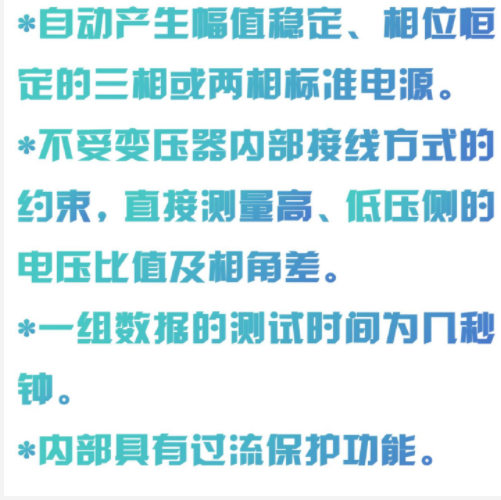 2.不受变压器内部接线方式的约束,直接测量高、低压侧的电压比值及相角差。