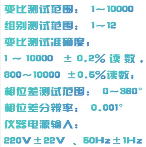 变比测试准确度:1~10000 ±0.2%读数,800~10000±0.5%读数;