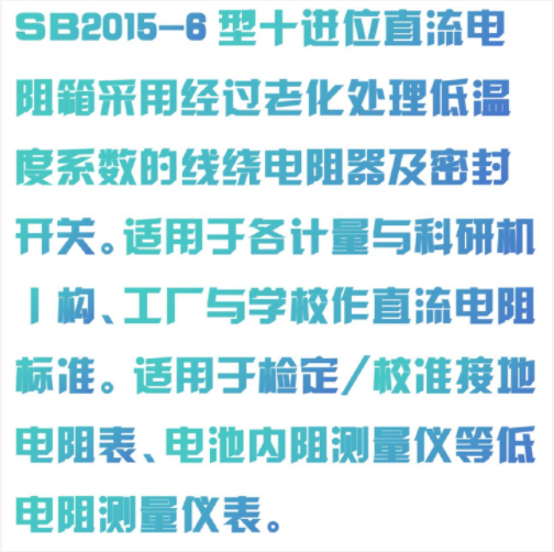 SB2015-6型十进位直流电阻箱采用经过特殊老化处理低温度系数的线绕电阻器及密封开关。适用于各计量与科研机丨构、工厂与学校作直流电阻标准。适用于检定/校准接地电阻表、电池内阻测量仪等低电阻测量仪表。