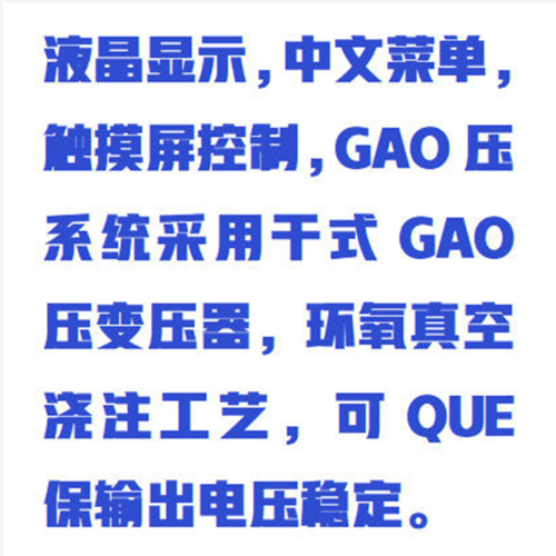 1、液晶显示,中文菜单,触摸屏控制,GAO压系统采用干式GAO压变压器,环氧真空浇注工艺,可QUE保输出电压稳定。