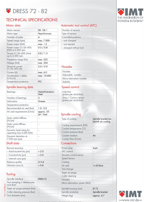 Dress72-81此款产品是德国IMT电主轴较早研发出的系列,砂轮修整电主轴专门用于磨床、蜗杆磨齿机的金刚石砂轮高精度修整,在欧洲是较早研发出砂轮修整电主轴的厂商,应用于磨床、砂轮修整电主轴蜗杆磨齿机中的金刚石砂轮高精度修整的场景,使用电主轴的方案修整砂轮可以做到精度更高、自动化程度更高等优势,该款主轴的防护等级可以达到IP68,在保证精度的同时保证了使用寿命,得到了市场的一致认可。本款产品的工具接口是8*M8,可以直接锁砂轮,也可定制您需要的工具夹持方案。上海炅远实业发展有限公司作为中国代理商,为国内客户提供前期选型、交付及售后服务。公司位于上海市松江区中电信息港内,拥有近500㎡的售后空间为客户提供全方面售后维修服务。在欧洲、日本多个历史悠久品牌机床应用广泛,如德国达创Datron,德国萨克SAACKE磨床机床,意大利NOVA磨床,日本冈本磨床OKAMOTO,日本西部磨床SEIBU等