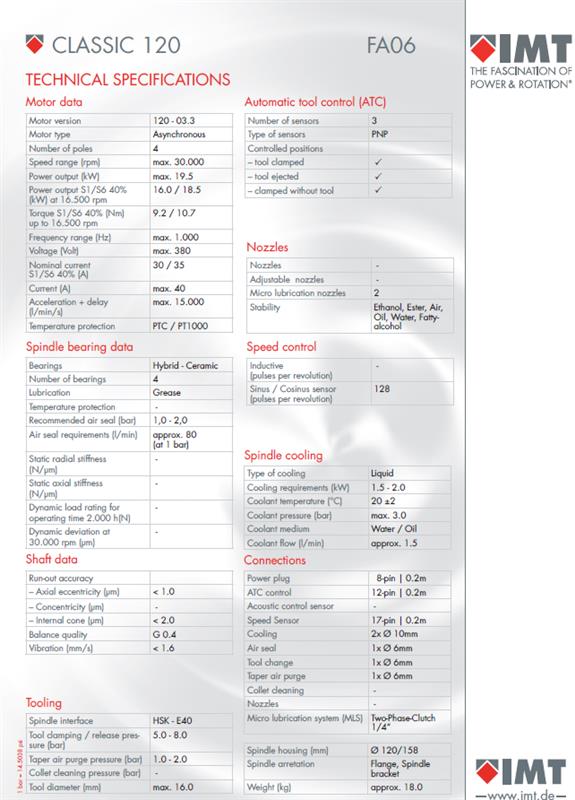 IMT总部及生产基地位于德国黑森州吉森市,在欧洲经济中心法兰克福北侧60KM,距离法兰克福机场车程1小时。是一家有25年历史的高度专业化的家族式大中型企业;从自研主轴“Dress V"问世至今,已形成“ECO"“Classic" “Robot" 等六大系列上百个型号。是一家集主轴设计、研发、生产、装配于一体的现代化企业,在欧美、亚太地区有多个领域数百家终端用户。在欧洲、日本多个历史悠久品牌机床应用广泛,如德国达创Datron,德国萨克SAACKE磨床机床,意大利NOVA磨床,日本冈本磨床OKAMOTO,日本西部磨床SEIBU等
