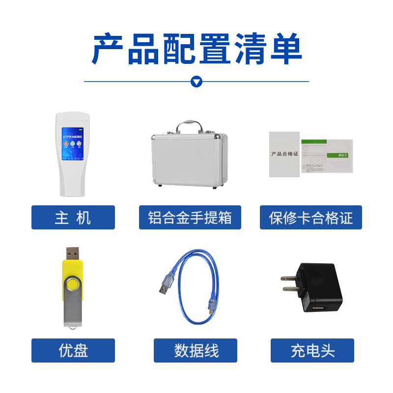 随机配置:餐具表面洁净度检测仪器(手持)主机、铝合金手提箱、驱动U盘、PC数据线、数据分析软件、中文操作手册
