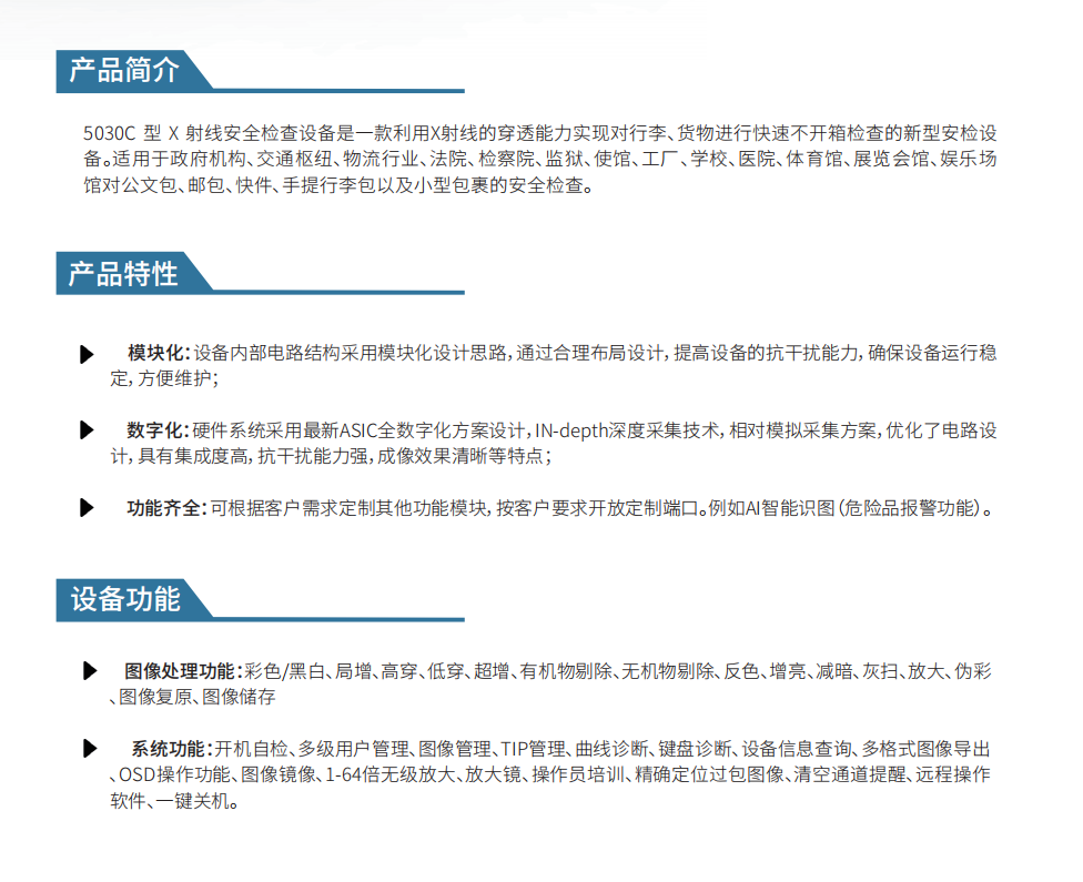 系统功能:开机自检、多级用户管理、图像管理、TIP管理、曲线诊断、键盘诊断、设备信息查询、多格式图像导出、OSD操作功能、图像镜像、1-64倍无级放大、放大镜、操作员培训、定位过包图像、清空通道提醒、远程操作软件、一键关机。