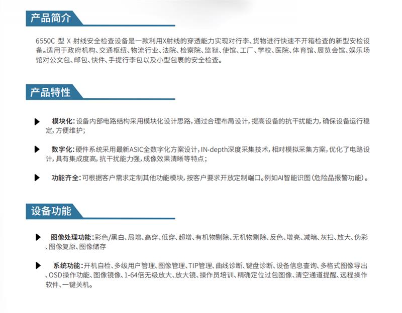 6550C型X射线安全检查设备是一款利用X射线的穿透能力实现对行李、货物进行快速不开箱检查的新型安检设备。适用于政府机构、交通枢纽、物流行业、法院、检察院、监狱、使馆、工厂、学校、医院、体育馆、展览会馆、娱乐场馆对公文包、邮包、快件、手提行李包以及小型包裹的安全检查。X射线安全检查设备X射线安全检查设备X射线安全检查设备