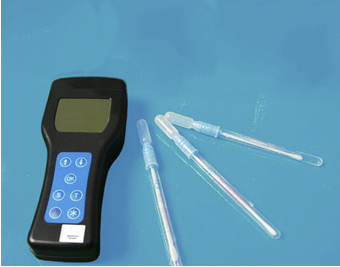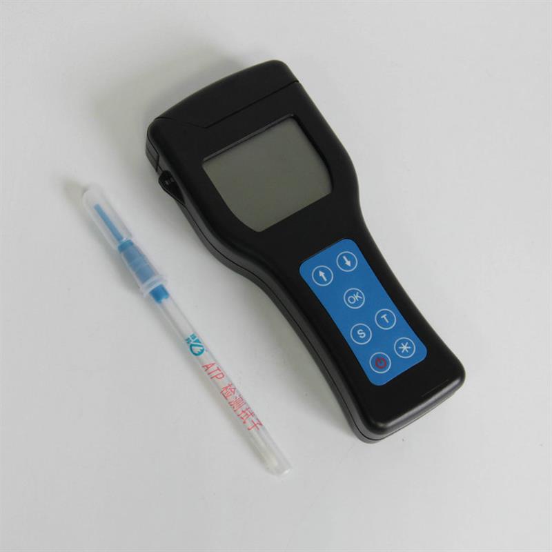 该设备采用生物化学反应方法检测ATP含量。使用时,用预先润湿的ATP拭子采集标本, ATP拭子被缓冲液浸湿,这样有助于从干燥或湿润的表面提取生物物质(ATP)。拭子含有可以裂解细胞膜的试剂,能将细胞内ATP释放出来,与试剂中含有的特异性酶发生反应,产生光,再用荧光照度计检测发光值,微生物的数量与发光值成正比。