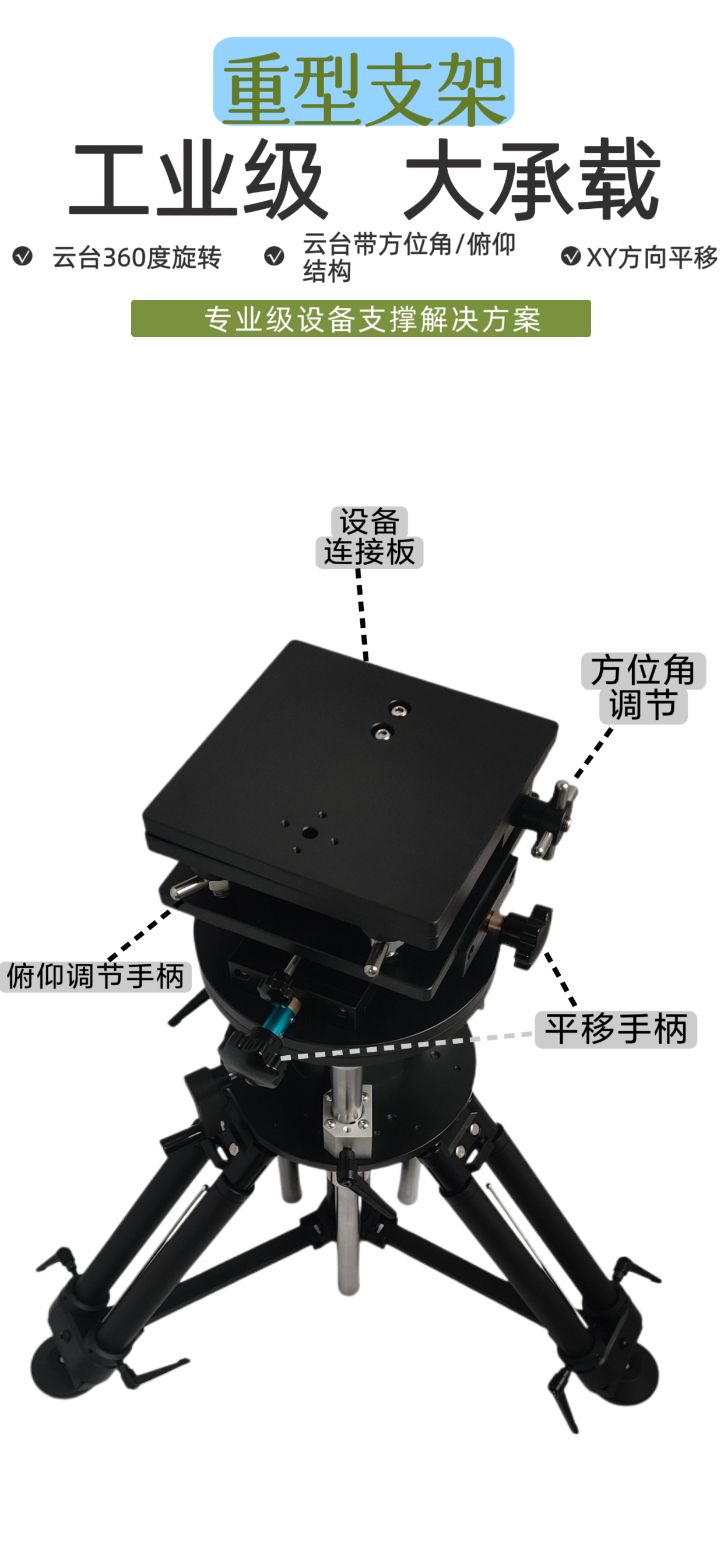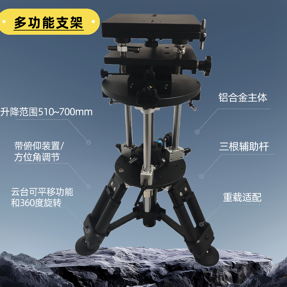 云台集成多项调节功能,具备360°水平旋转、XY轴双向平移功能,其中X轴平移行程40mm,Y轴平移行程40mm;同时搭载方位角微调装置与俯仰微调装置,满足精细调节需求。