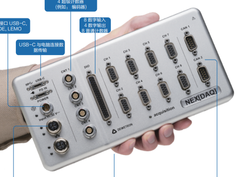 电源选项NEX[DAQ] 提供多种电源供电选择,在任何环境下都可以轻松 无忧地使用: > 通过USB-C PD 接口: > 例如市面最常用的USB-C接口可直接用于给设备供电 > 也可使用常见的智能手机充电宝进行供电 > 通过Lemo 接头供电会有一个宽范围电源可选择, 可以直接连 接到汽车的电源部分(12 V, 24 V) > 使用PoE注入器或PoE交换机可以通过以太网供电多通道可扩展NEX[DAQ] 数据采集设备是分布式的。如果8个模拟通道不够 用, 多个NEX[DAQ]设备可以在任何时候连接成一个多通道数采 系统 一根线缆用于数据传输并通过网络PTP/IEEE1588进行同 步。 无论一台或者是多台NEX[DAQ] , 由于他的体积和重量小, 当工 程师们需要乘飞机快速到达工作地点时,NEX[DAQ] 是测试工 程师们理想的旅行伴侣。甚至可以将它装到自己的口袋里或者 和笔记本电脑一起携带。这使它成为解决问题的理想工具, 设备 的维护和调试, 例如台架和一些大型机械等。