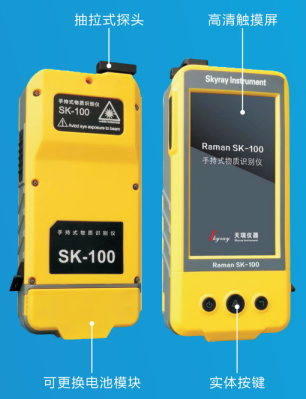 Raman SK100   采用拉曼光谱技术作为检测手段,是新一代手持式物质识别仪,是体积、重量最轻的手持物质识 别仪,并集成了智能操作终端。